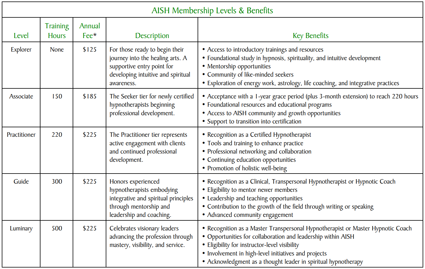 The Association for Integrative & Spiritual Hypnotherapists (AISH) offers a Student Membership category for individuals who are currently enrolled in an AISH approved school.